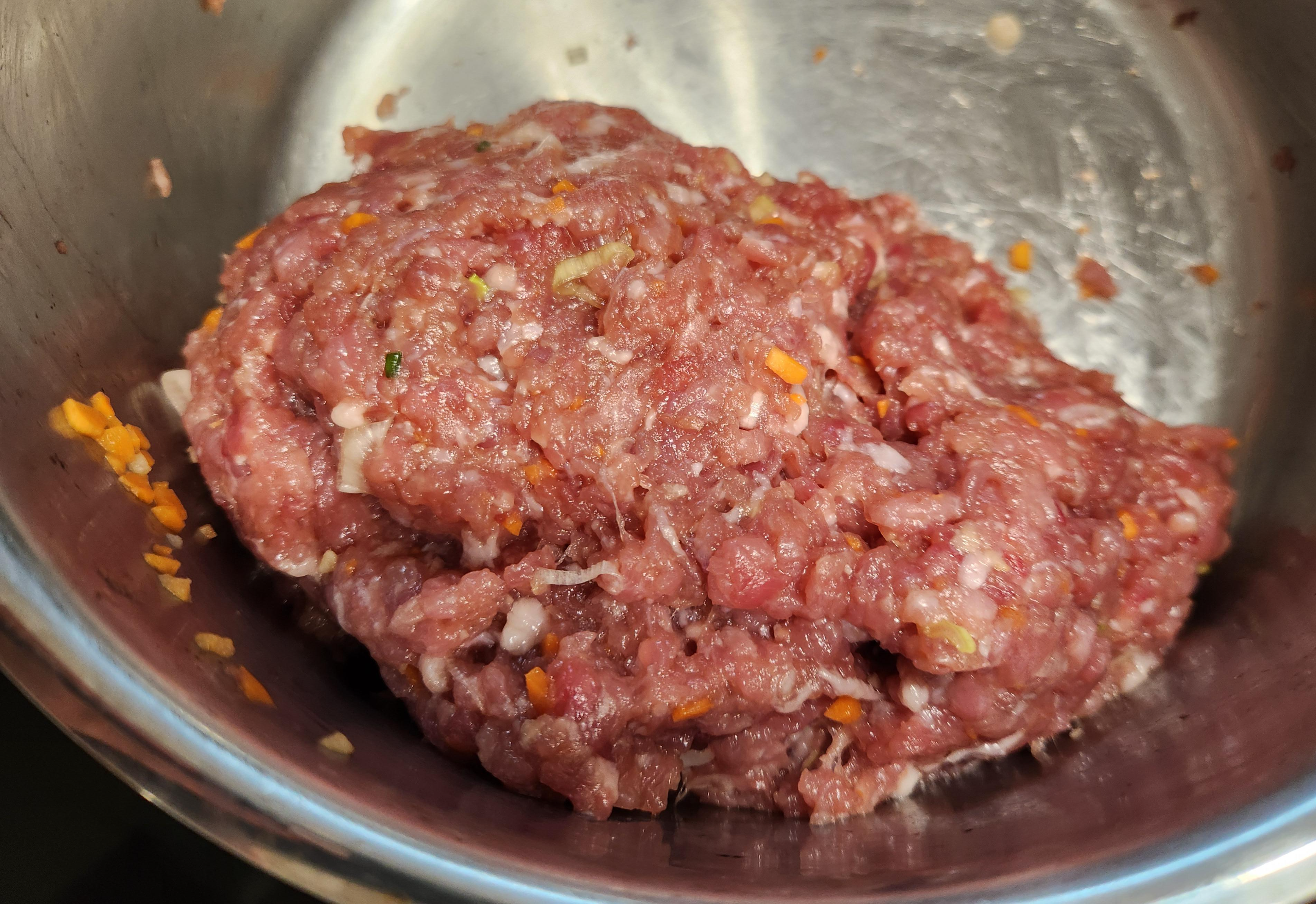영상에서는 돼지고기에 대파와 청양고추를 넣어 만들었는데, 저는 아이도 같이 먹을 예정이라 청양고추는 빼고 냉장고에 있던 당근을 넣었어요.