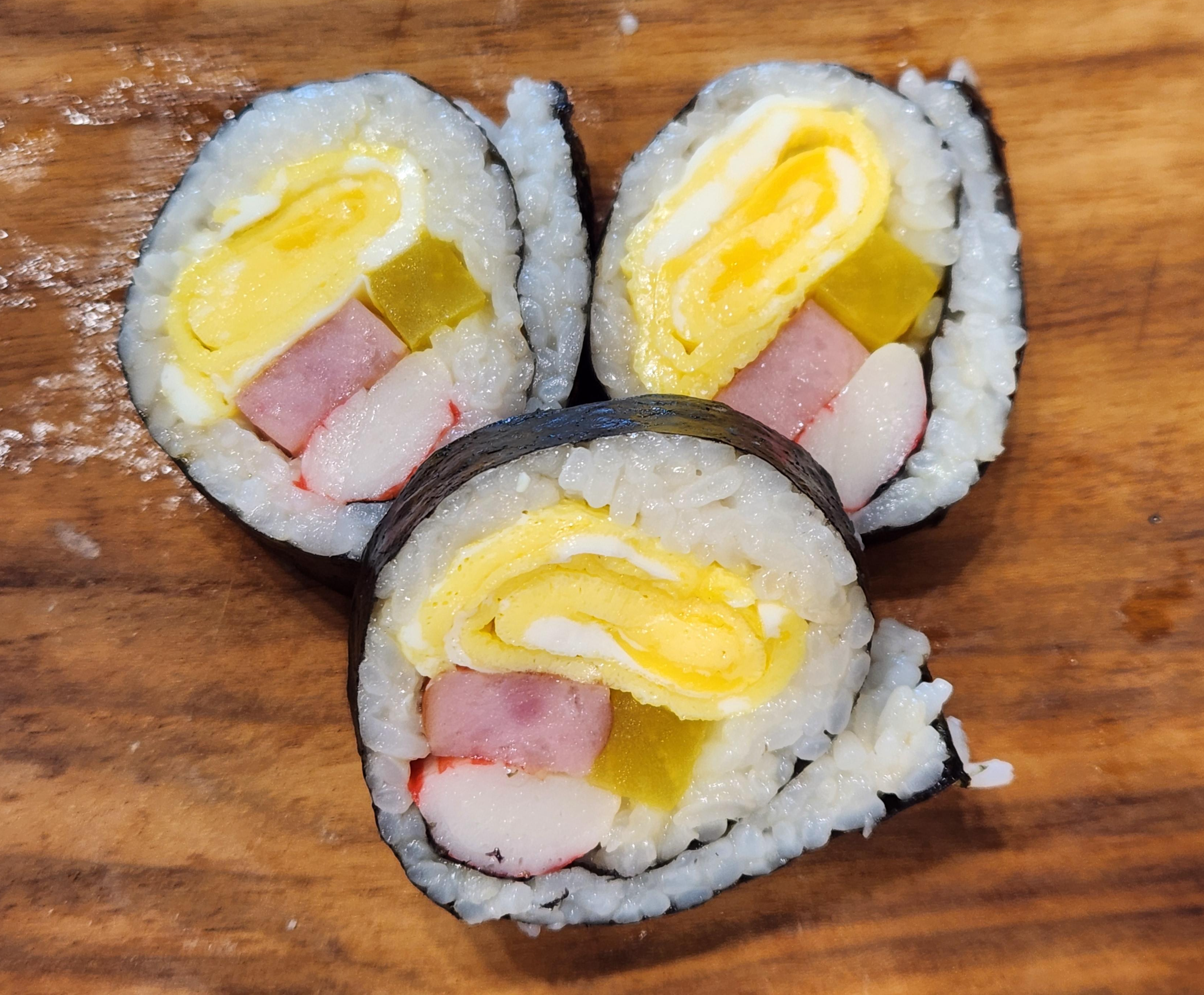 주말 아침, 간단하고 든든한 메뉴가 먹고 싶어 김밥을 만들기로 했다. 원래는 오이, 시금치, 당근, 어묵 등 기본 재료를 모두 넣으려고 했지만 전날 미리 사놓지 않아 집에 있던 것들로만 준비했다. 대신 채소는 빼고 계란말이를 두툼하게 만들어 넣는 방식으로 김밥을 완성했다.