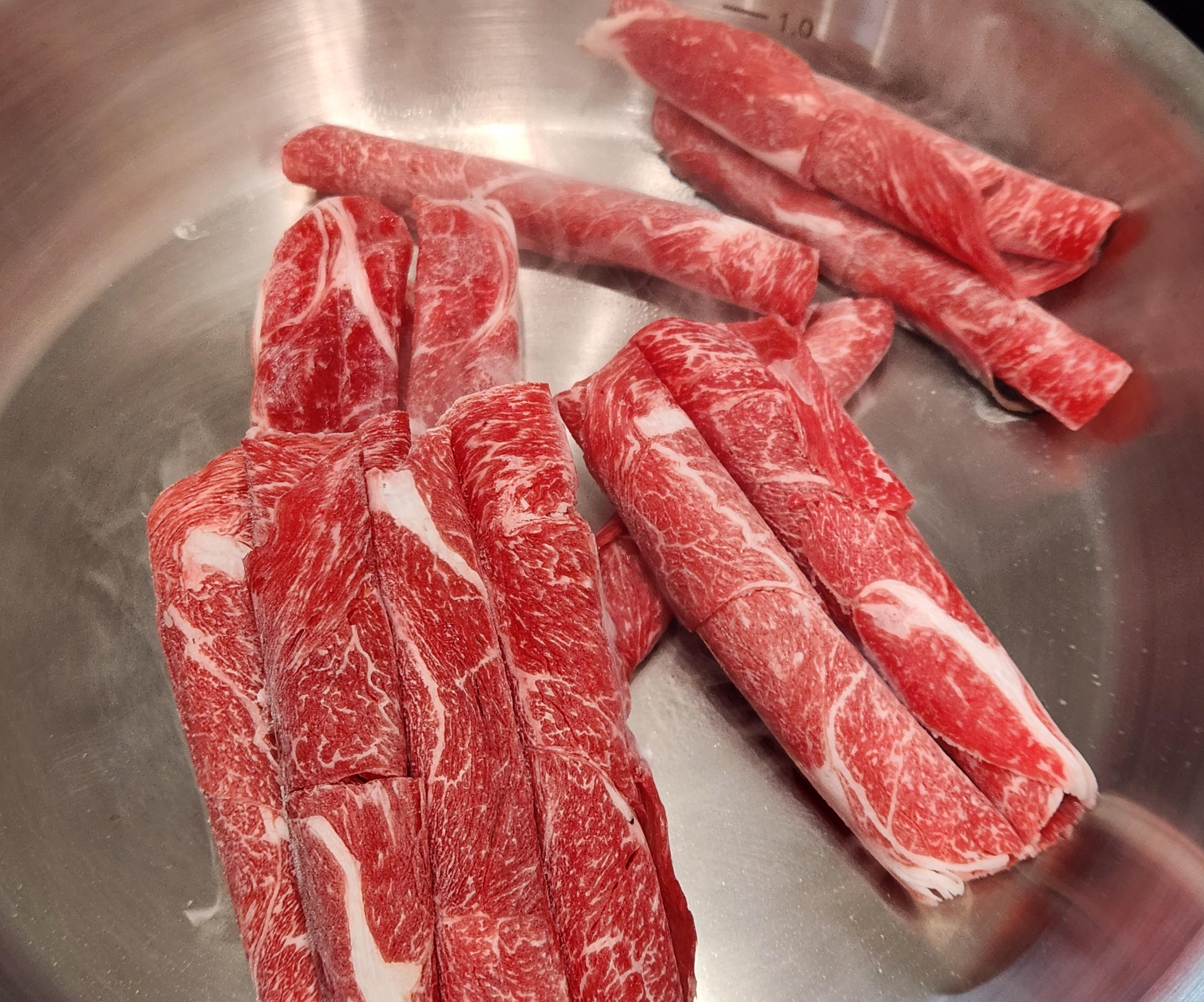기름을 살짝 두른 뚝배기에 우삼겹 100g을 넣고 볶아준다.