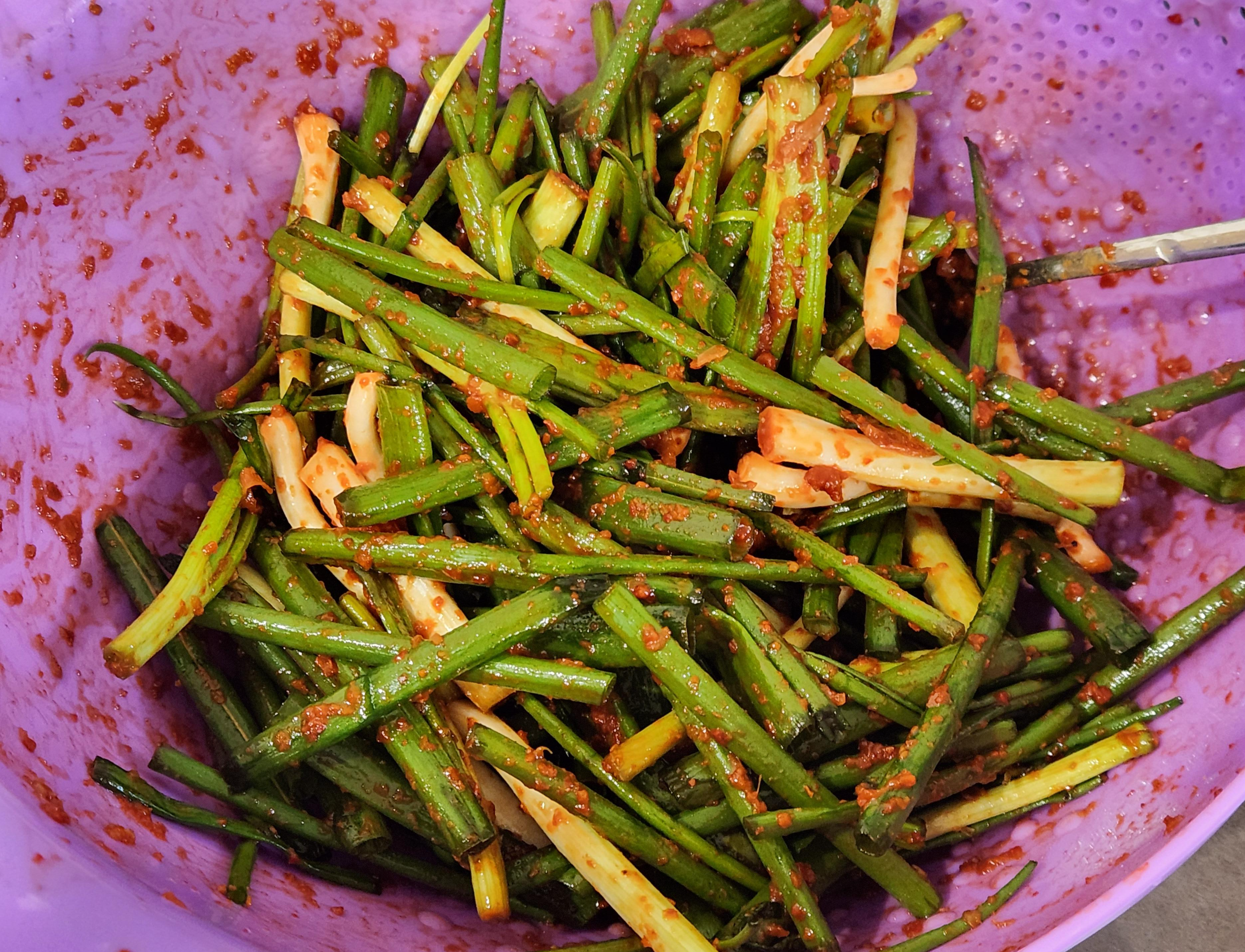 별도의 복잡한 양념 제조 없이, 보관 중이던 김장양념을 베이스로 활용했습니다. 김장양념 특유의 깊은 맛이 쪽파와 만나 훌륭한 즉석 반찬이 되었습니다.